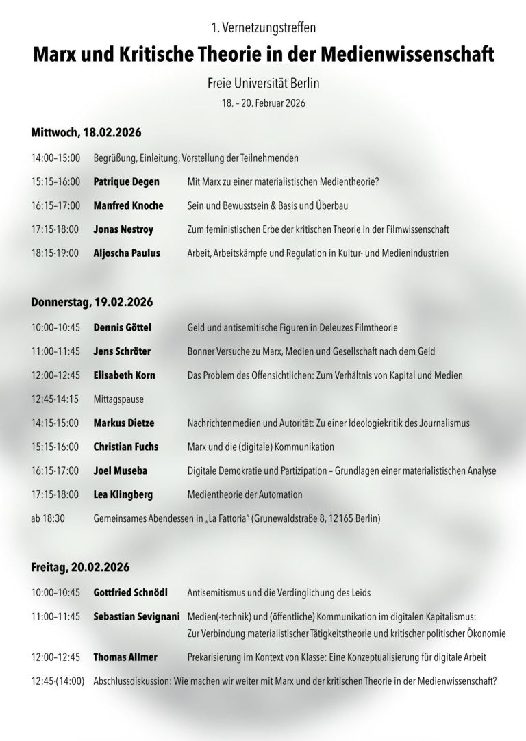 Im Februar 2026 versammelten sich am Seminar für Filmwissenschaft an der Freien Universität Berlin Forscher*innen des deutschsprachigen Raums, um sich über Themen, Methoden, Chancen und Probleme auszutauschen, die sich aus dem Zusammendenken von Medien mit Texten aus der kritischen Theorie sowie aus der Marxschen und marxistischen Tradition ergeben. Das Treffen wurde von Patrique Degen, Markus Dietze und Elisabeth Korn organisiert.